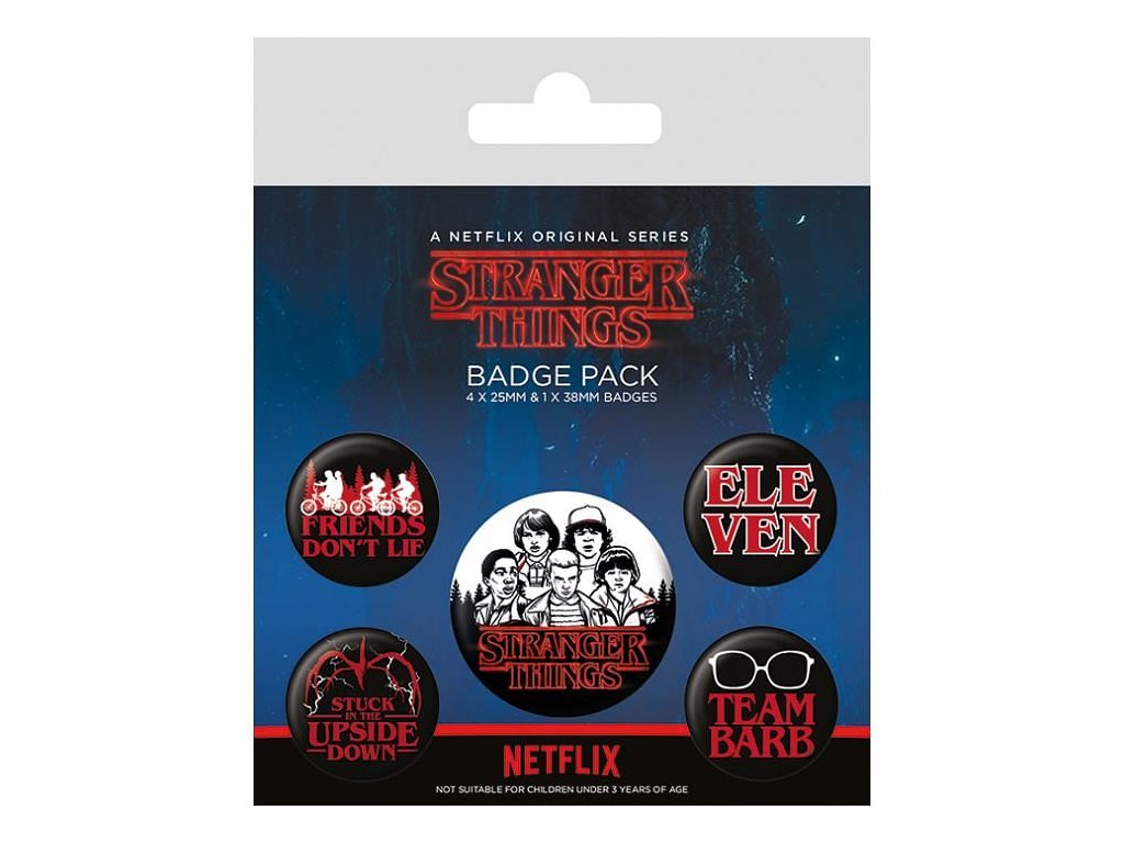 V sade nájdete 5 ks okrúhlych odznakov (4x malé a 1x veľký) s motívmi postáv a s grafikou z hororového seriálu Stranger Things.