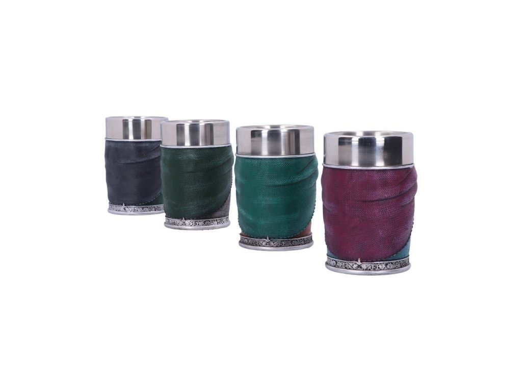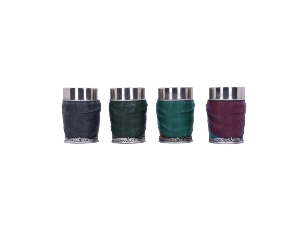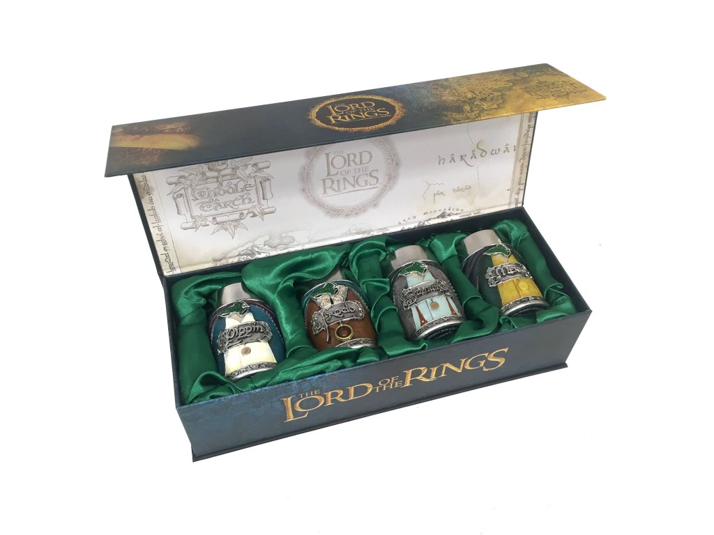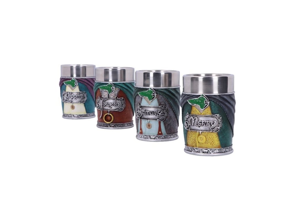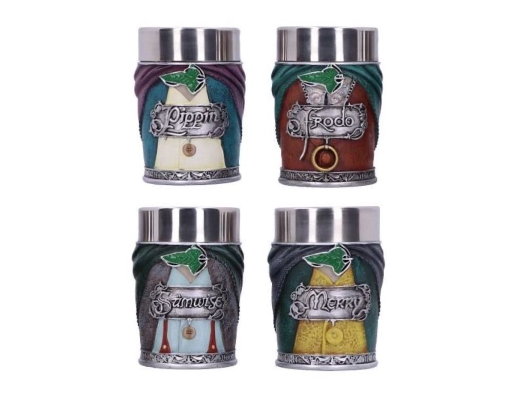 Štamprle, polovica, drobček... V tejto sade nájdete hneď štyri krásne hobitie drobčeky, odeté do elfích plášťov a nesúce mená štvorice malých členov Spoločenstva prsteňa z fantasy ságy Pán prsteňov: Frodo, Sam, Pipin a Smieško. Na panákoch nájdete jedinečné detaily, ako sú Frodov Prsteň moci či spony v podobe elfích lístkov. Všetko ručne maľované. Panáky majú objem 6 cl, vysoké sú 8,3 cm, priemer 5,4 cm. Vnútorná časť hobitích panákov je z nerezovej ocele a je vyberateľná, čo umožňuje ich ľahkú údržbu. Panáky nie sú vhodné do mikrovlnnej rúry ani do umývačky riadu.