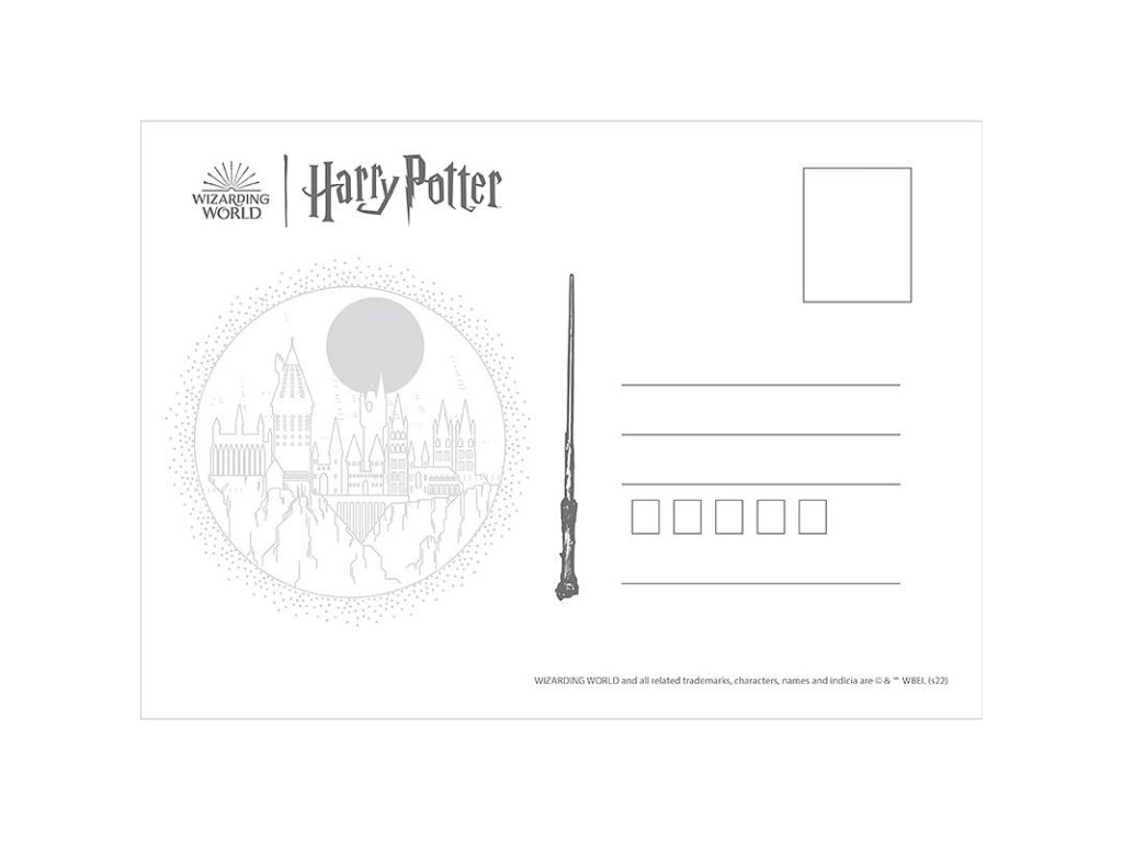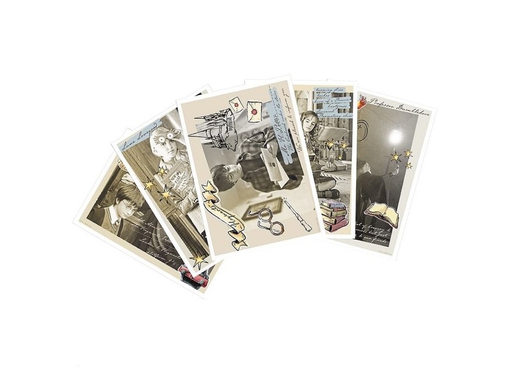 Sada obsahuje 5 pohľadníc s obľúbenými postavami filmových príbehov o Harrym Potterovi. Zašlite priateľom prianie alebo pozdrav z Rokfortu! Na pohľadniciach nájdete Harryho, Hermionu Grangerovú, Rona Weasleyho, Lenku Láskorádovú a profesora Albusa Dumbledora.