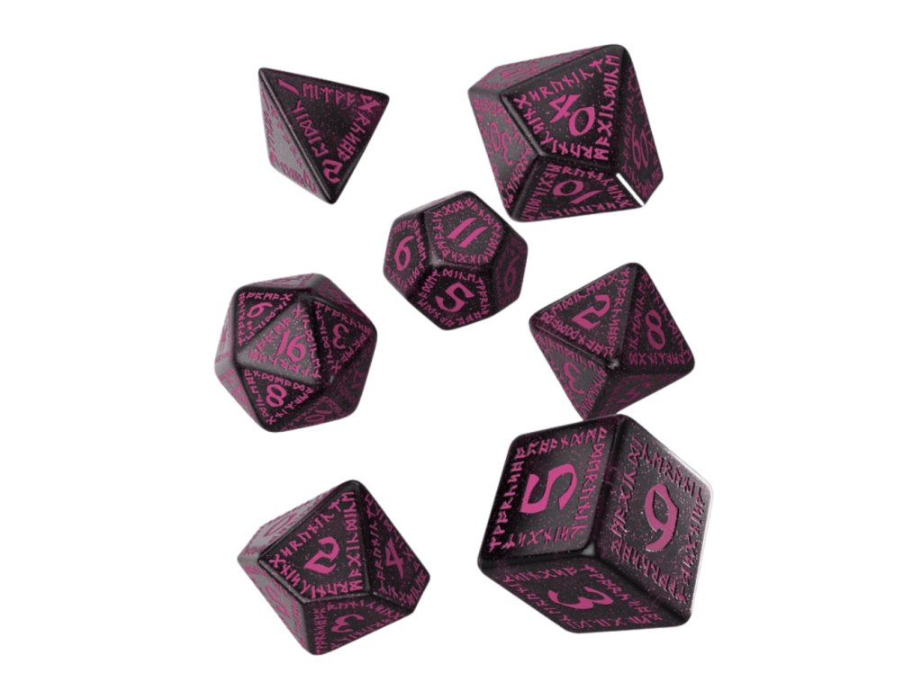 Sada precízne vyvedených kociek s gravírovanými nápismi v trpasličích runách, ideálny doplnok pre hráčov hier na hrdinov. Sada obsahuje sedem kociek: štyroch, šiestich, ôsmich, desiatich, dvanástich, dvadsiatich stennú a percentovú kocku. Kocky sú k dispozícii vo farbe čierna-magenta (červeno-fialová).