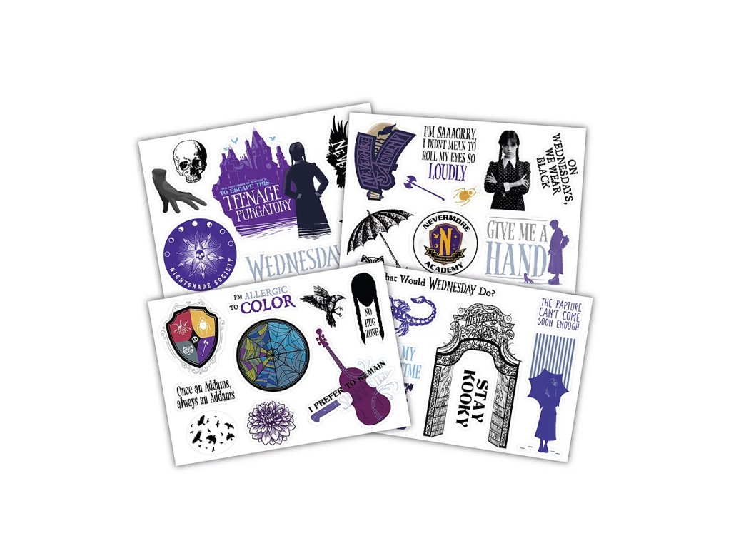 Vytuň si svoj notebook, smartfón alebo tablet týmito úžasnými samolepkami z populárneho seriálu Wednesday od Netflixu. Balíček obsahuje 33 kvalitných samolepiek rozdelených na 4 hárkoch. upusť uzdu svojej fantázii a polep všetko, čo sa ti dostane pod ruku... prosím ušetri nábytok.