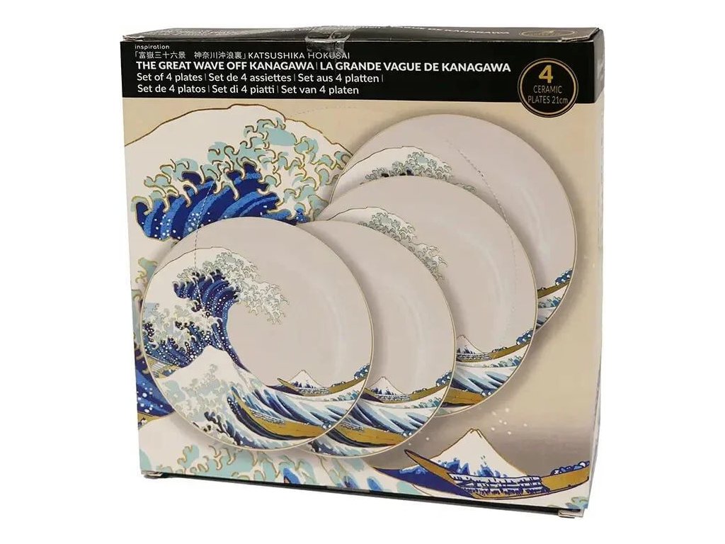 konická vlna, ktorá dobyla svet – teraz môže zdobiť aj tvoj stôl! Táto sada 4 keramických tanierov je inšpirovaná slávnym dielom japonského majstra Hokusaia a prináša do každodenného stolovania kúsok japonska. Taniere majú priemer 21 cm. Hodí sa nielen na bežné použitie, ale skvele vyniknú aj ako dekorácia. Pokiaľ miluješ japonské umenie, minimalizmus alebo len hľadáš niečo výnimočné na stôl, táto sada je presne pre teba. Taniere sú vhodné do umývačky a mikrovlnky.