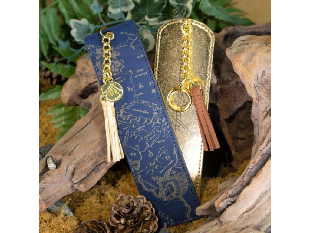 Udržujte svoje miesto v obľúbených fantasy knihách so štýlovou sadou dvoch záložiek inšpirovaných Pánom prsteňov! Každá záložka s rozmermi 17 x 4,5 cm je ideálna pre fanúšikov Stredozeme, ktorí chcú spojiť praktickosť s originálnym dizajnom. Jedna záložka je zdobená mapou Stredozeme, druhá nesie elfský text Jedného prsteňa. Vyrobené z odolného koženkového materiálu.