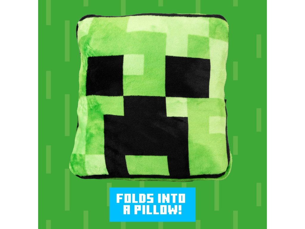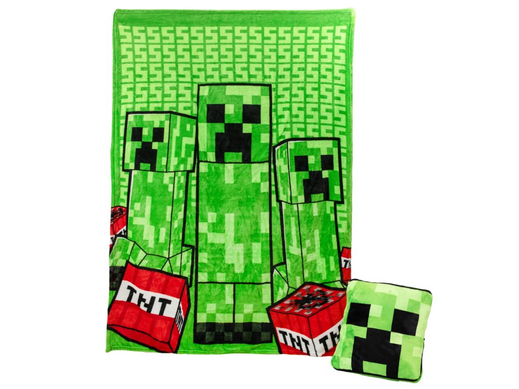 Či už sa chystáš na piknik s priateľmi hráčmi Minecraftu alebo si chceš urobiť pohodlie doma na gauči, vankúš a deka v jednom s Creepermi a TNT je tou správnou voľbou! Vďaka originálnemu prevedeniu si môžeš vankúš rozložiť na mäkkú deku alebo naopak - zložiť deku do ľahko prenosného vankúša. A to nie je všetko! Na zadnej strane deky nájdeš praktické vrecko, do ktorého môžeš umiestniť rôzne drobnosti, napr. herné náčinie. Rozmery rozloženej deky sú 120 x 150 cm.