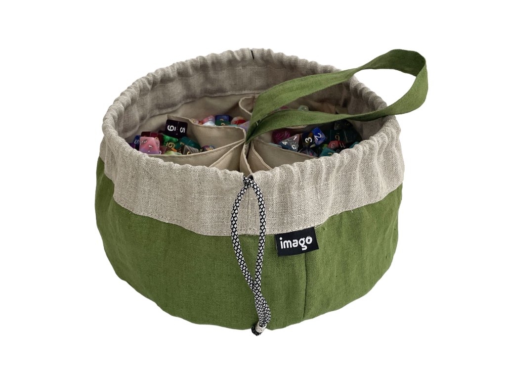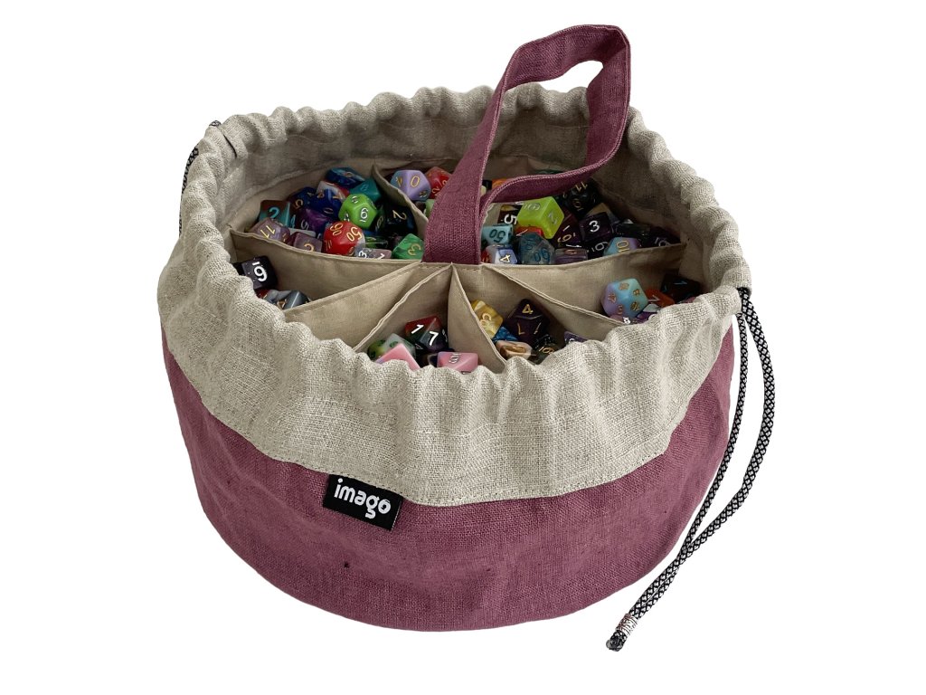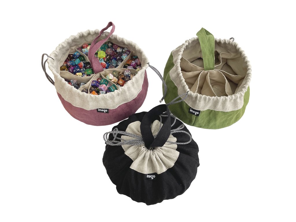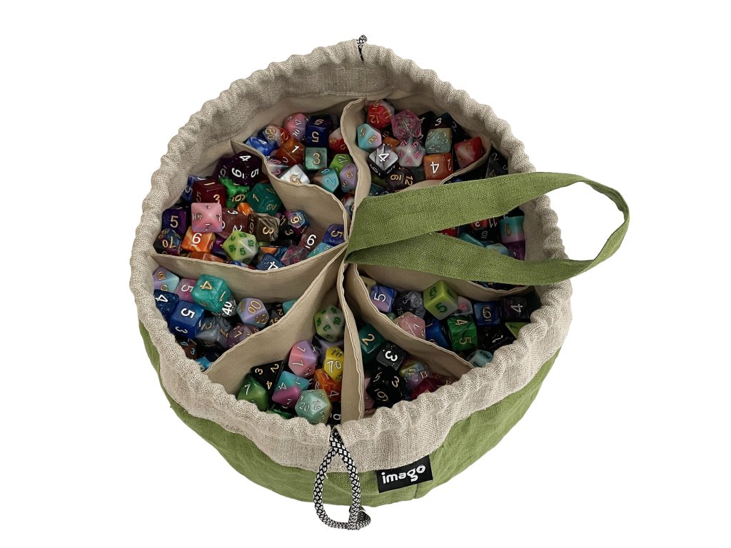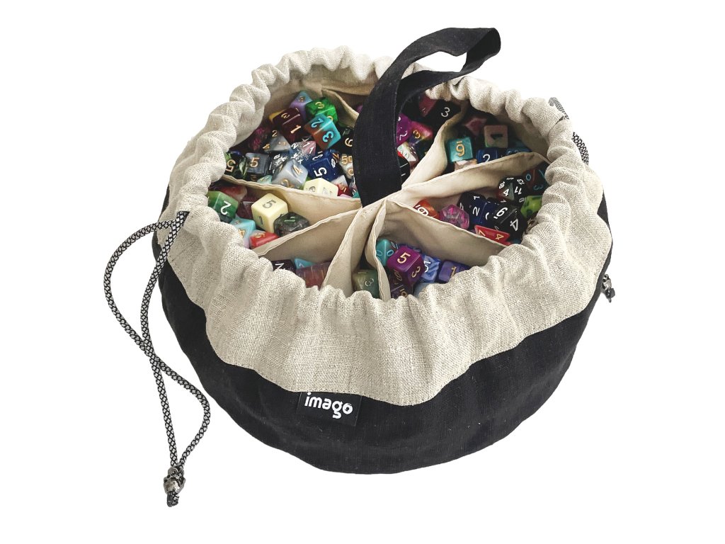Obrí vak na kocky od imago pojme cez 500 kociek vďaka ôsmim vnútorným vreckám. Každé vrecko je pevne prešité a chráni tvoje obľúbené kúsky pred poškodením či stratou. Vak je prehľadný – vždy nájdeš presne tú správnu sadu kociek, ktoré potrebuješ. Vak (vačok by v tomto prípade bola tak trochu urážka…) je vyrobený z pevného plátna s polstrovaním, takže sám drží tvar a zostáva na stole otvorený. Zatvára sa sťahovacími šnúrkami a je opatrený aj pevným stredovým pútkom pre ľahkú manipuláciu a prenášanie. Vnútorné priehradky sú zo 100% bavlneného plátna. Dno je vypolstrované rúnom. Vonkajší obal je zo 100% ľanu. Šnúrky sú opatrené na koncoch kovovými koncovkami. POZOR! Koncovky v tvare lebky sú iba na čiernej variante. Priemer vaku je 26 cm, výška 15 cm.