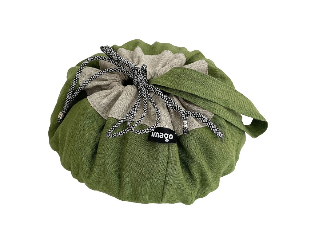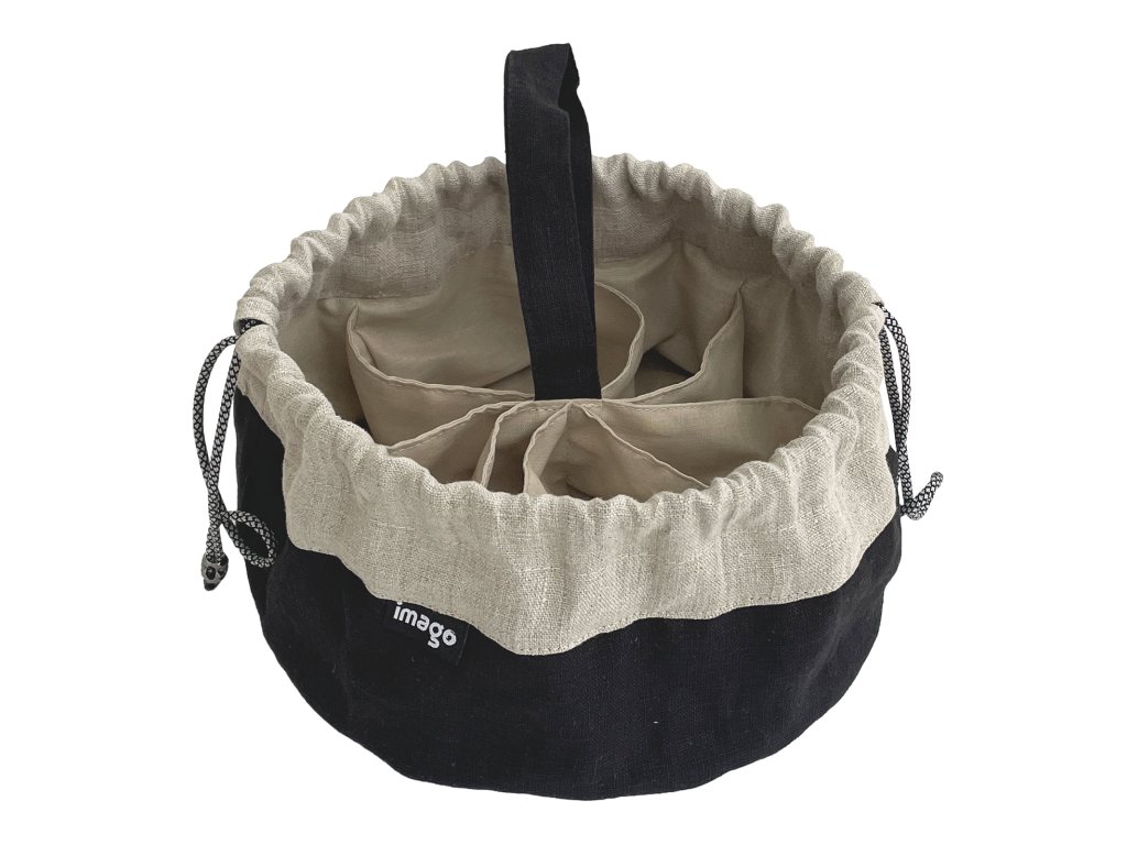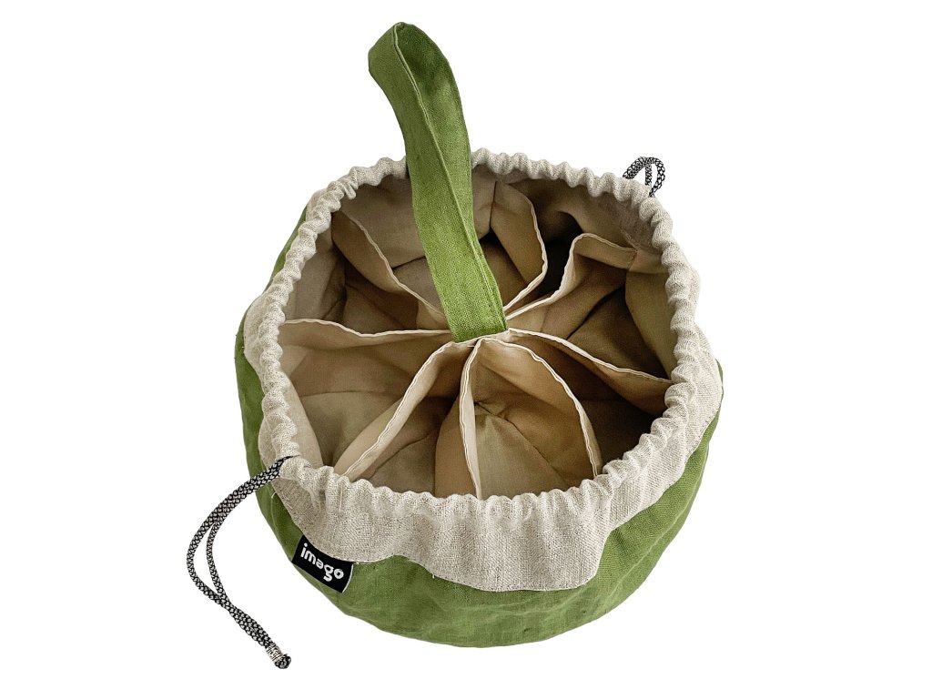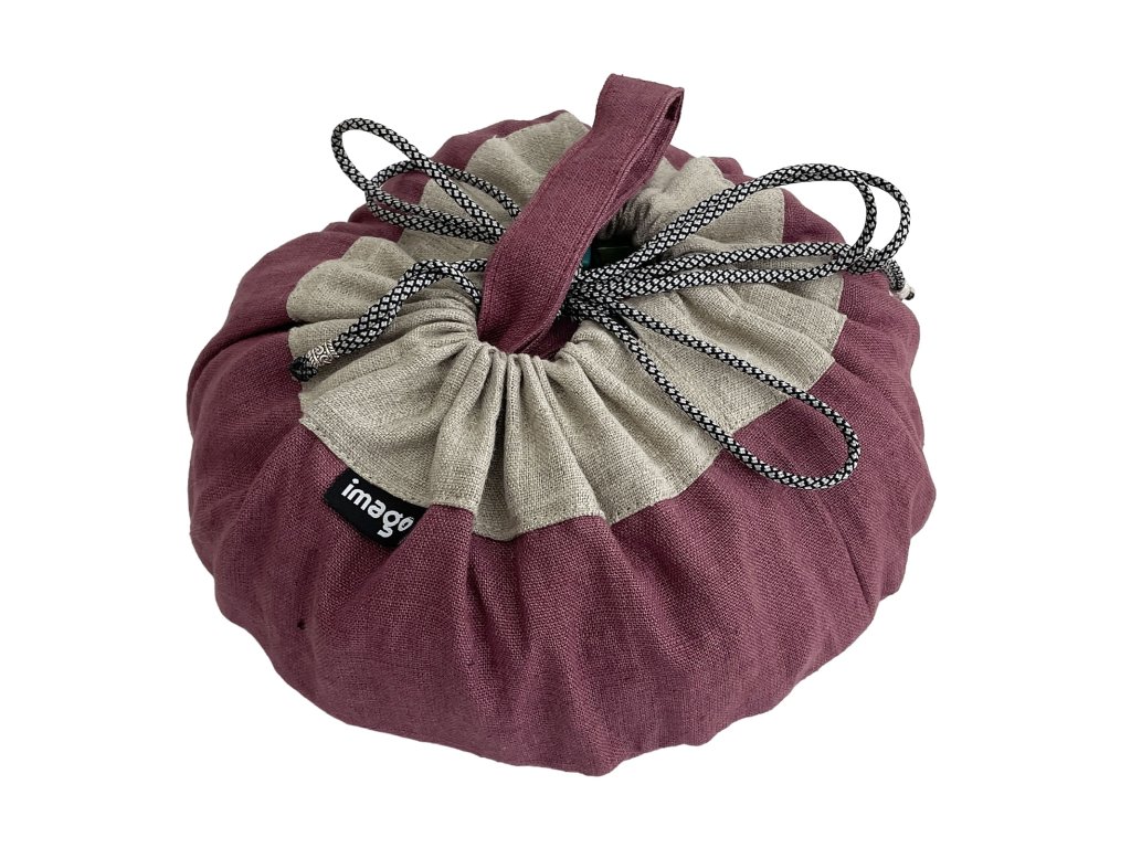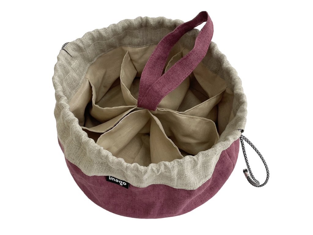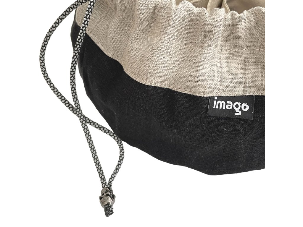 Obrí vak na kocky od imago pojme cez 500 kociek vďaka ôsmim vnútorným vreckám. Každé vrecko je pevne prešité a chráni tvoje obľúbené kúsky pred poškodením či stratou. Vak je prehľadný – vždy nájdeš presne tú správnu sadu kociek, ktoré potrebuješ. Vak (vačok by v tomto prípade bola tak trochu urážka…) je vyrobený z pevného plátna s polstrovaním, takže sám drží tvar a zostáva na stole otvorený. Zatvára sa sťahovacími šnúrkami a je opatrený aj pevným stredovým pútkom pre ľahkú manipuláciu a prenášanie. Vnútorné priehradky sú zo 100% bavlneného plátna. Dno je vypolstrované rúnom. Vonkajší obal je zo 100% ľanu. Šnúrky sú opatrené na koncoch kovovými koncovkami. POZOR! Koncovky v tvare lebky sú iba na čiernej variante. Priemer vaku je 26 cm, výška 15 cm.