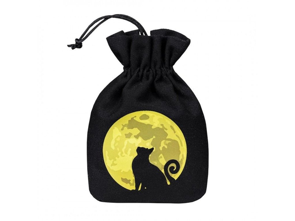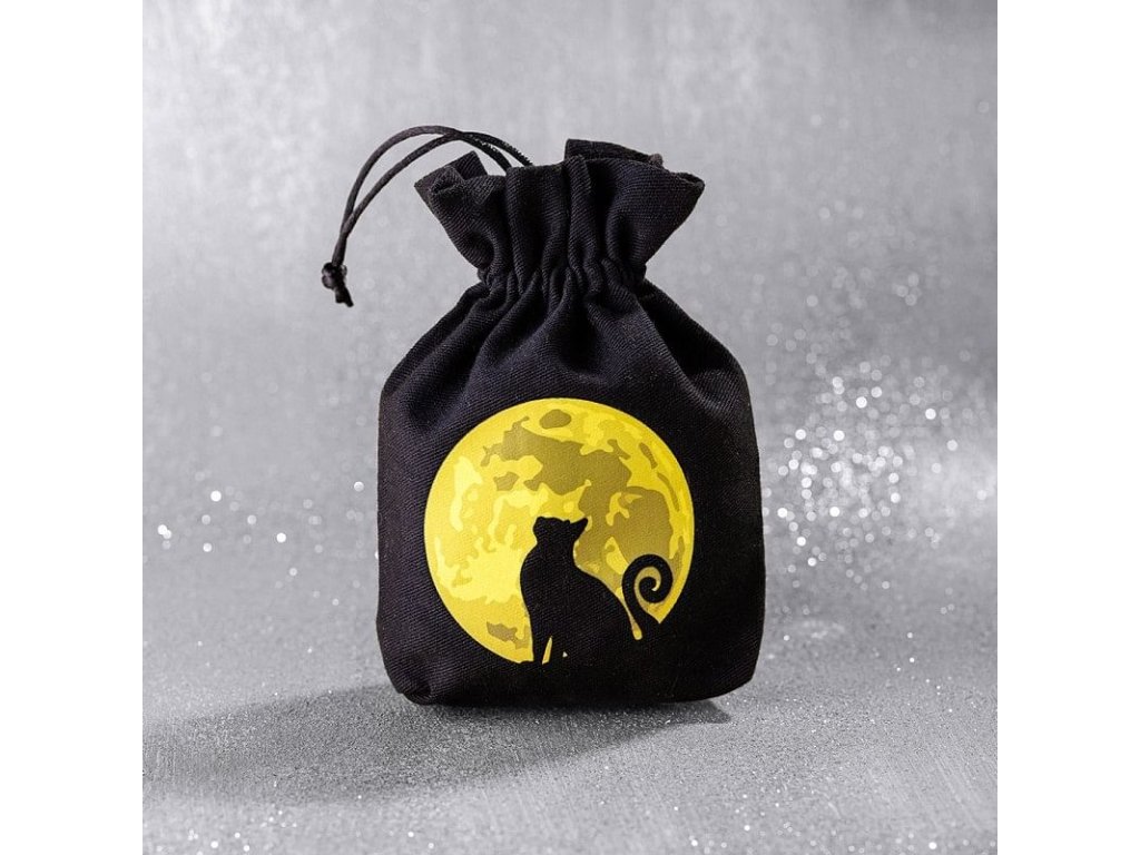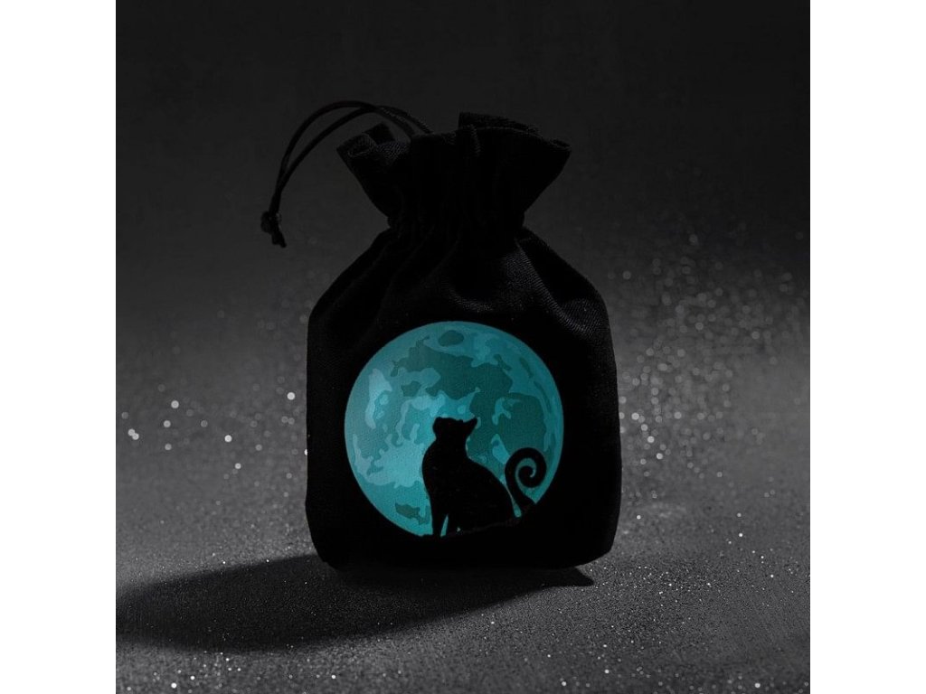 Krásne čierne vrecúško na kocky s mačkou, mesačnou strážkyňou, svieti v tme. Vrecko pojme až sad 9 kociek a bude jedinečným doplnkom pre vaše hranie. Skvele sa hodí na mačaciu sadu kociek CATS: Modern. Vačok sa sťahuje pomocou šnúrky s plastovou brzdičkou.
