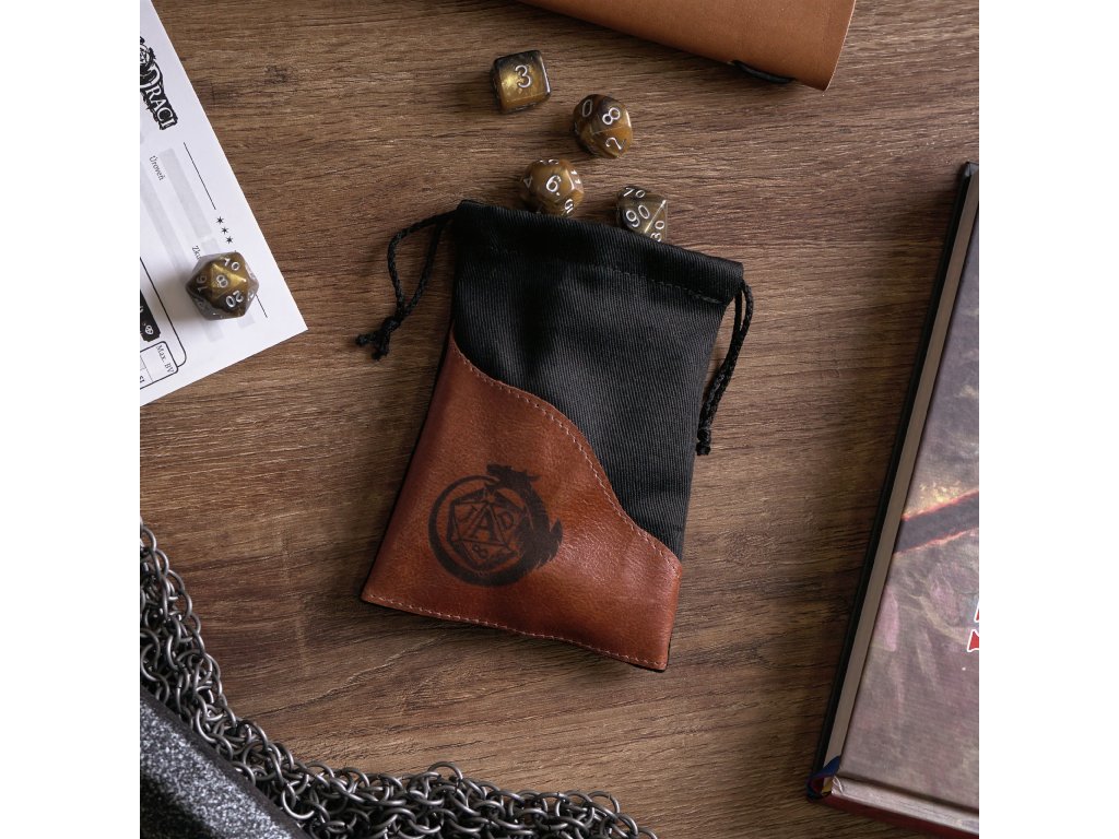 Pevný plátený vačok na kocky starostlivo vyrobený v našej dielni. Pri veľkosti 9 x 13 cm do neho vmestnáte niekoľko sád kociek, prípadne figúrky, žetóny a ďalšie drobnosti, ktoré sa hodia pri hraní hier na hrdinov. Vačok je ozdobený prúžkom hovädzej kože s vypáleným logom hry Jaskyne a draci. Zaručene urobí radosť každému hráčovi RPG – či už máte radi Jaskyne a Draky, Dungeons & Dragons, Dračí brloh alebo Dračiu hliadku. Nie ste deťmi chaosu a krivé línie vám prídu rušivé? Máme pre vás rovný vačok rádu.