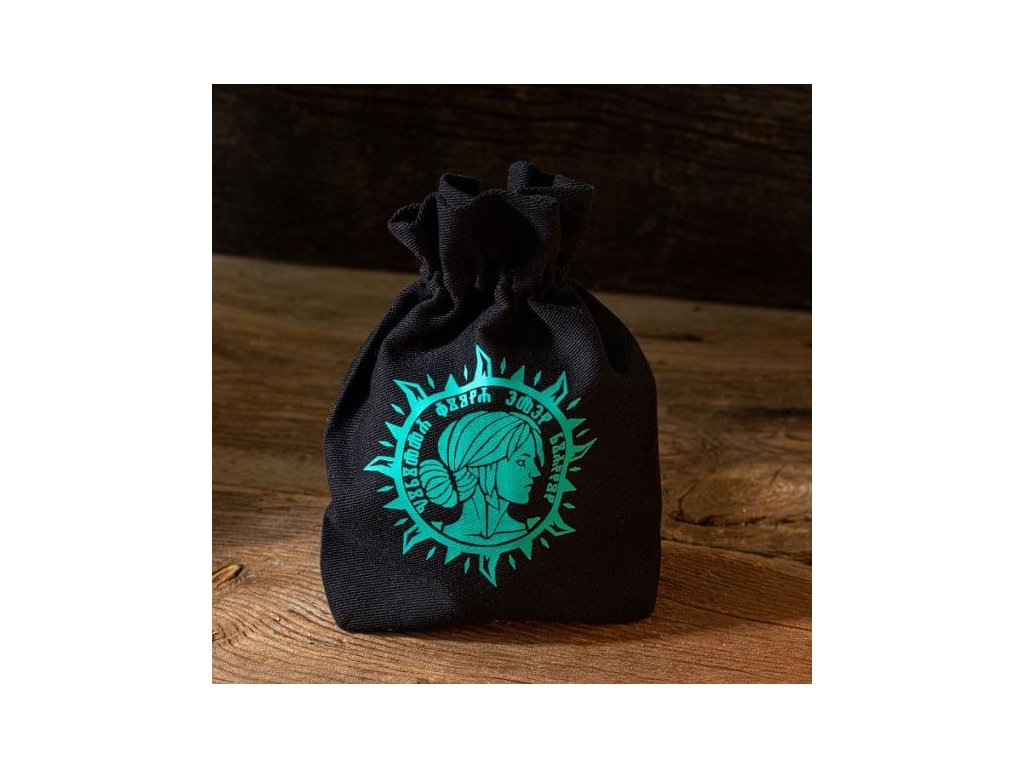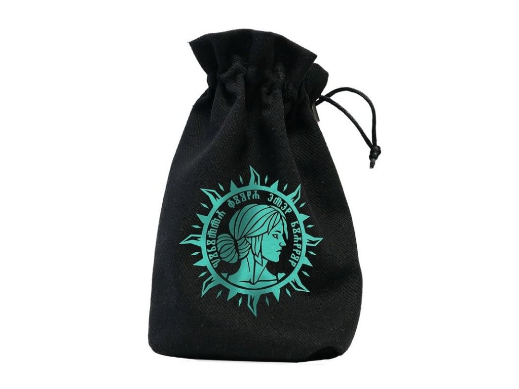Čierny bavlnený vačok na kocky s tyrkysovou podobizňou princeznej Ciri, Levíčajte z Cintry a Geraltovej adotptívnej dcéry - rozmaznávajte a chráňte svoje kocky! Vrecko sa sťahuje pomocou šnúrky s brzdou a pojme až päť sád kociek.