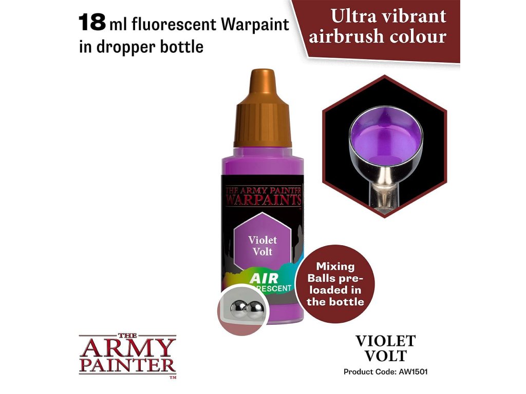 Vysoko kvalitná akrylová farba Warpaints Air Fluo Violet Volt určená na aplikáciu striekacou pištoľou - airbrush. Vhodná pre miniatúry akéhokoľvek druhu. Obsahuje 18 ml farby.