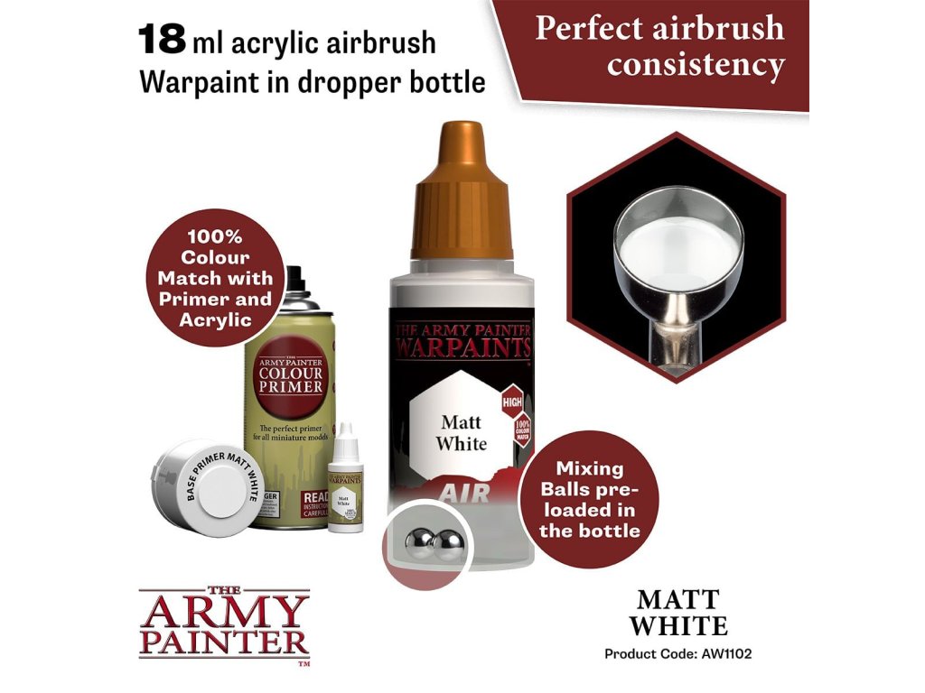 Vysoko kvalitná akrylová farba Warpaints Air Matt White určená na aplikáciu striekacou pištoľou - airbrush. Vhodná pre miniatúry akéhokoľvek druhu. Obsahuje 18 ml farby.