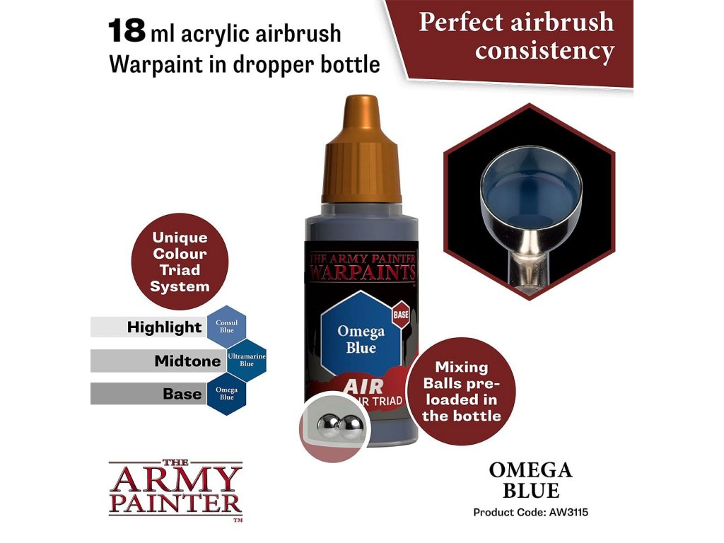 Vysoko kvalitná akrylová farba Warpaints Air Omega Blue určená na aplikáciu striekacou pištoľou - airbrush. Vhodná pre miniatúry akéhokoľvek druhu. Obsahuje 18 ml farby.