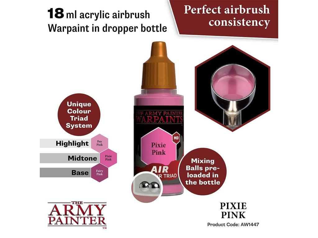 Vysoko kvalitná akrylová farba Warpaints Air Pixie Pink určená na aplikáciu striekacou pištoľou - airbrush. Vhodná pre miniatúry akéhokoľvek druhu. Obsahuje 18 ml farby.
