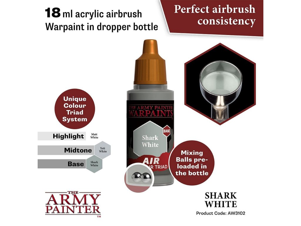 Vysoko kvalitná akrylová farba Warpaints Air Shark White určená na aplikáciu striekacou pištoľou - airbrush. Vhodná pre miniatúry akéhokoľvek druhu. Obsahuje 18 ml farby.
