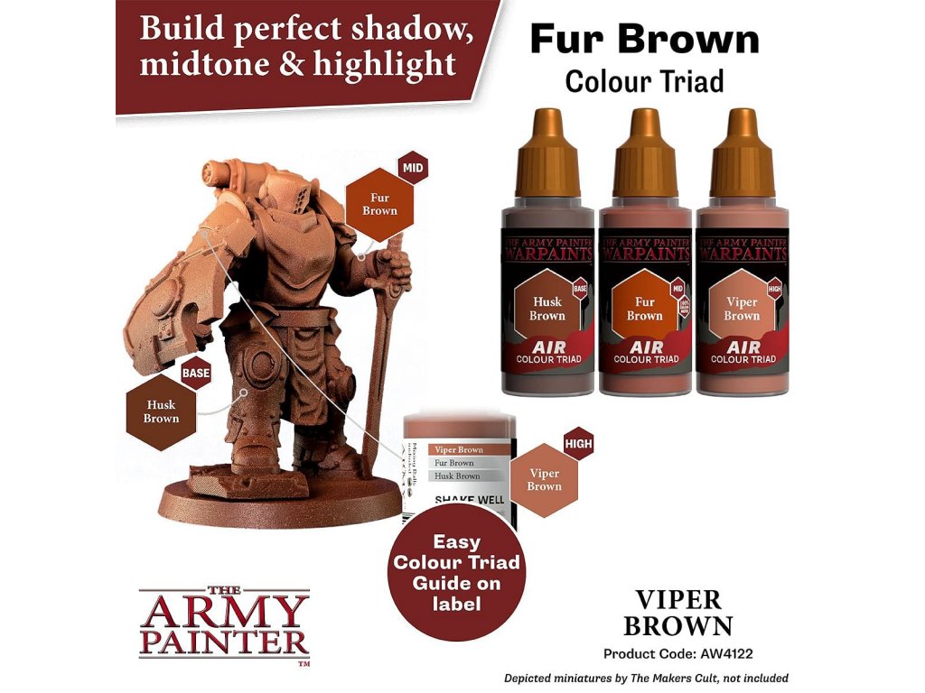 Vysoko kvalitná akrylová farba Warpaints Air Viper Brown určená na aplikáciu striekacou pištoľou - airbrush. Vhodná pre miniatúry akéhokoľvek druhu. Obsahuje 18 ml farby.