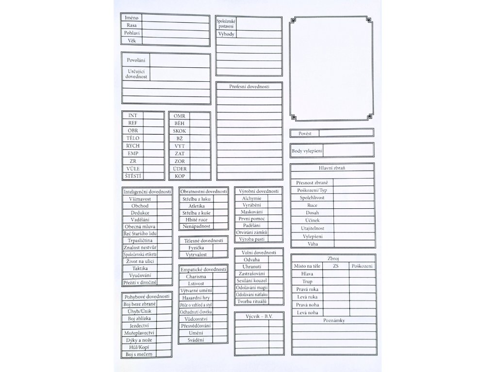 Praktický denník – karta postavy pre fantasy hru na hrdinov Zaklínač. Karta obsahuje 4 stránky formátu A4, tlačená je na papier veľkosti A3 preložený napoly.