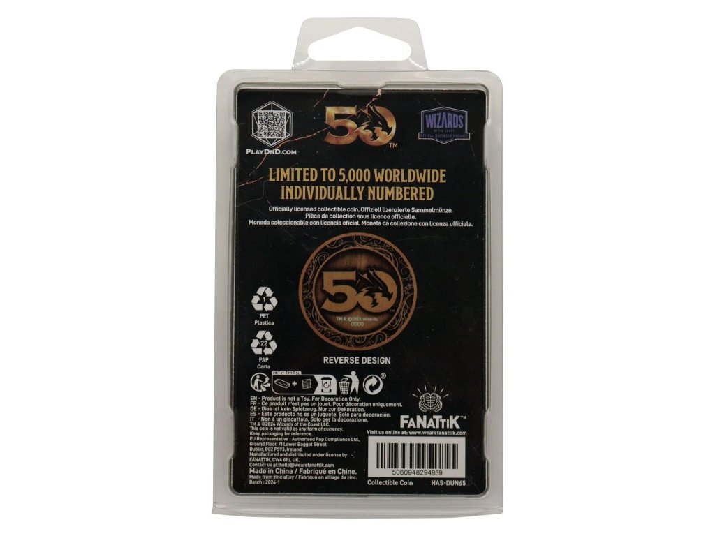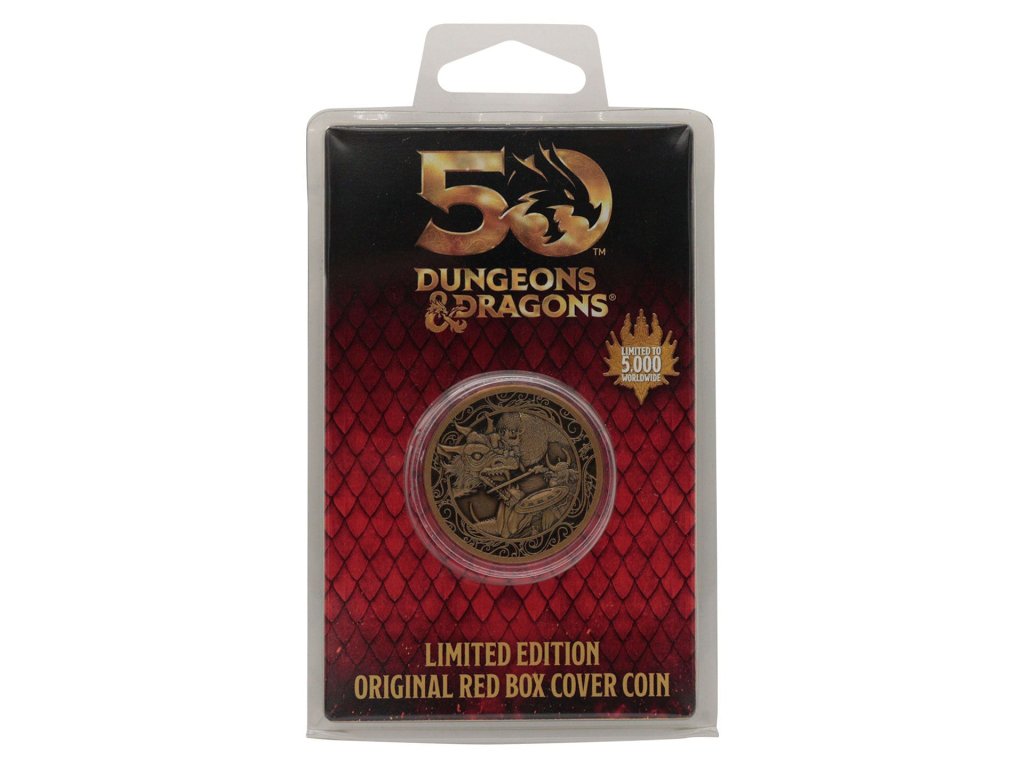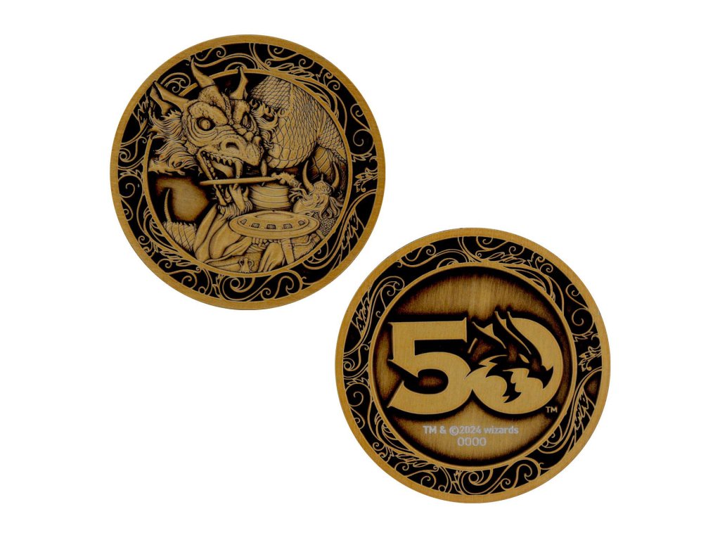 Táto limitovaná edícia zberateľskej mince s priemerom 38 mm na oslavu 50. výročia Dungeons & Dragons, najvýznamnejšieho RPG, aké kedy existovalo, je vyrazená s dizajnom pôvodnej príručky základných pravidiel. Mince so starožitným vzhľadom má číslovanie, pretože existuje len ako jedna z 5000 po celom svete.