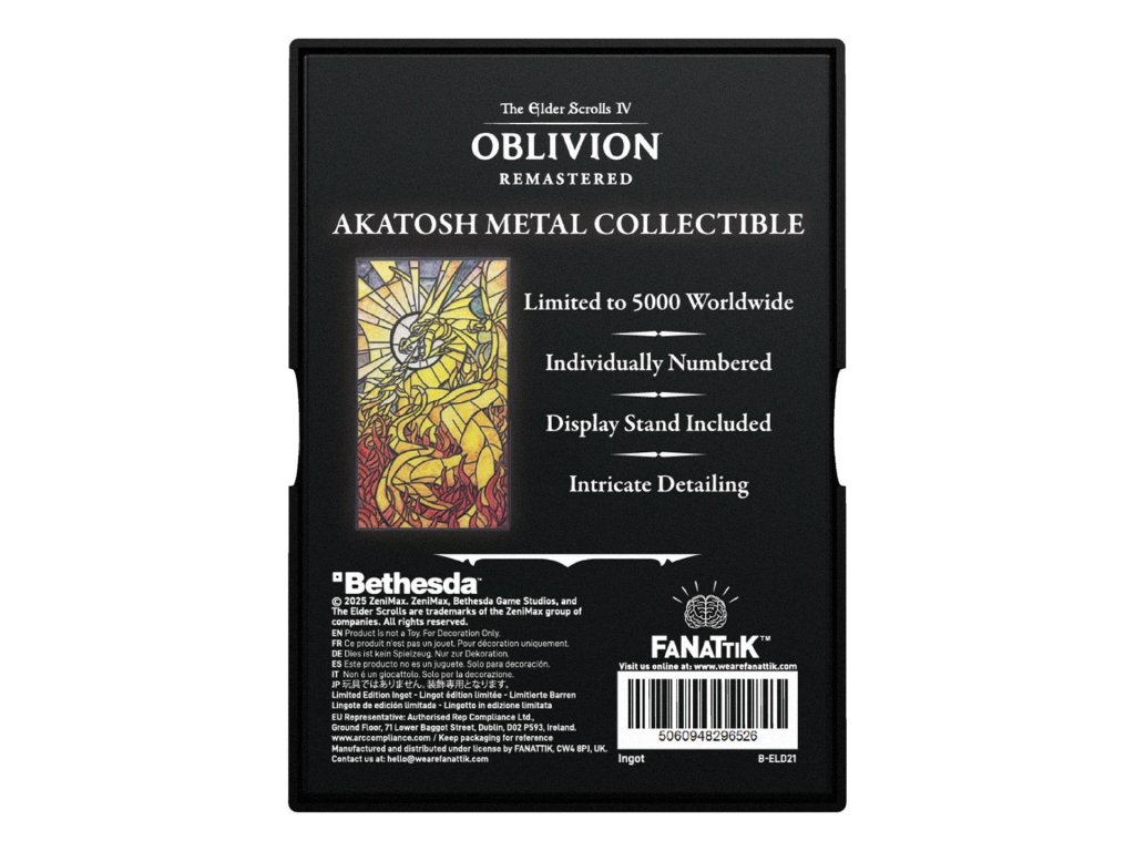 Zberateľský ingot The Elder Scrolls IV: Oblivion - Akatosh vzdáva poctu dračiemu bohu času a hlavnému božstvu Deviatich božských. Ingot s rozmermi 100 × 56,8 mm je vyvedený v elegantnej čiernej niklovej úprave a zdobený farebnou potlačou v štýle vitráže, ako ho poznajú hráči zo svätýň v Tamriele. Každý kus je číslovaný na zadnej strane a dodávaný v prezentačnej krabičke s vystavovacím stojanom. Limitované na 5 000 kusov celosvetovo. Oficiálne licencovaný artefakt – duchovný symbol, ikonický dizajn a zberateľská hrdosť v jednom.